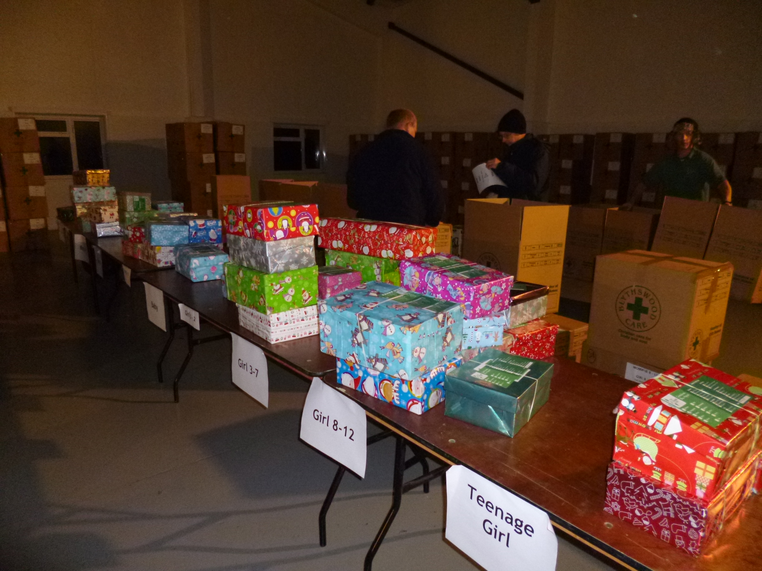 …..removing anything inappropriate, either because it is on the “no” list or because it is not suitable for the age or sex stated on the box. In some cases extra items are added to fill the box and an age appropriate book in Bulgarian is the added. The list is stuck on the top of the box, a rubber band put round it and it is then taken to the table at the end of the room and……