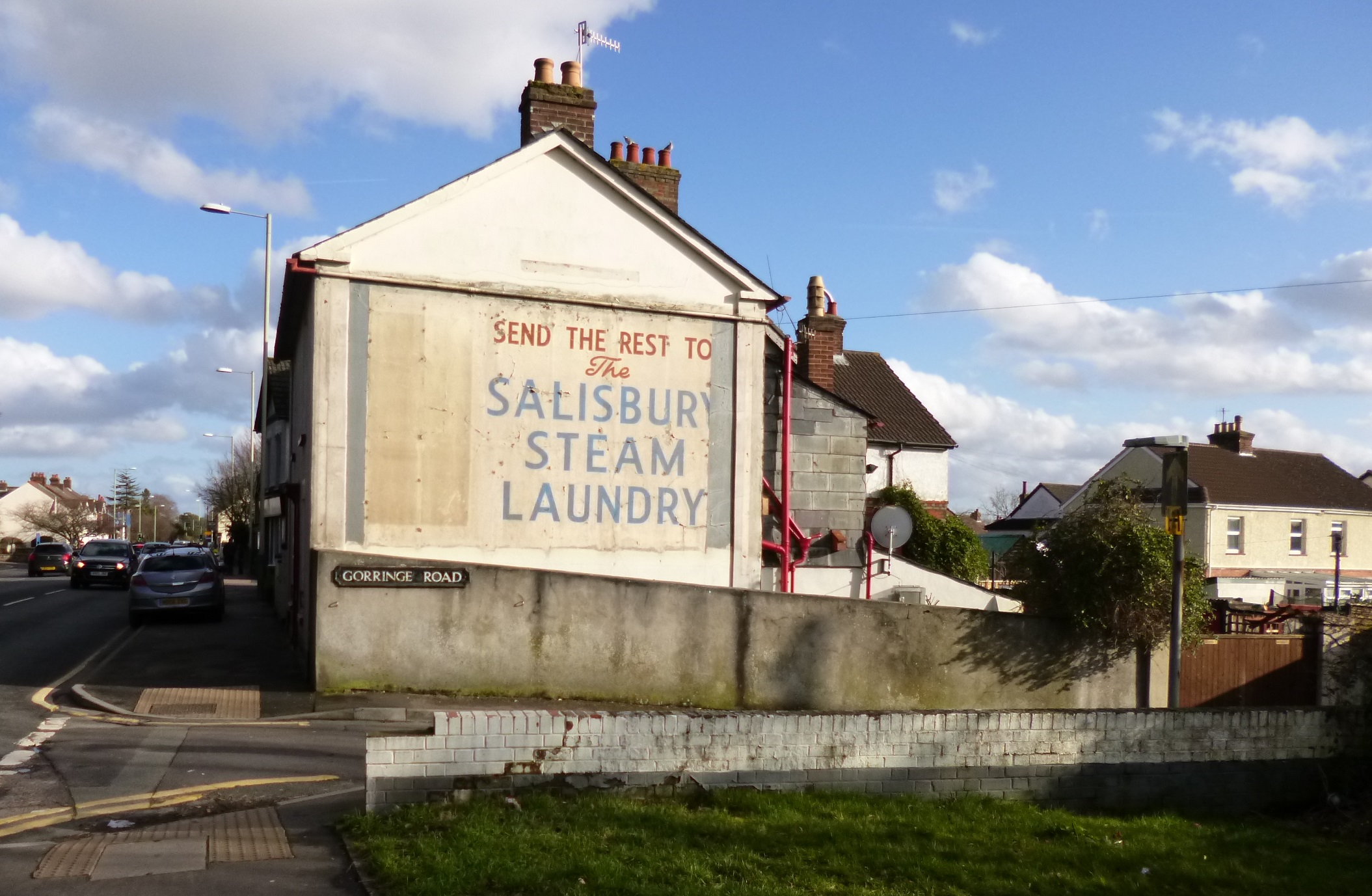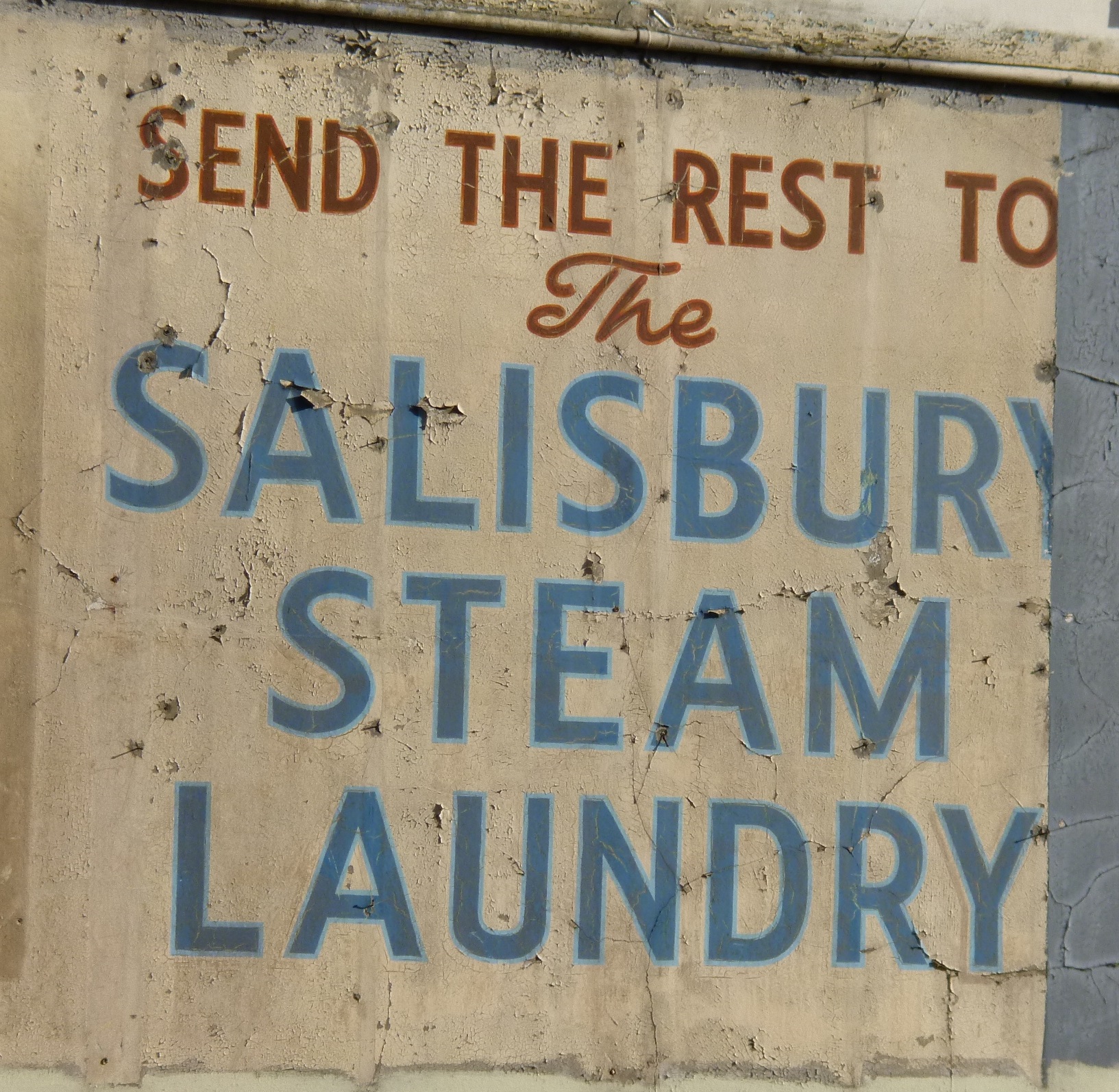 Looking on the internet, pictures of the Salisbury Steam Laundry building were quite easy to find.  What  history I could find was in some planning information from a developer, which suggested that the actual laundry closed about 4 decades ago, but had been there since at least 1851 or was it 1905?  Different sources give different dates!  That gives considerable scope for the age of the advertisement!