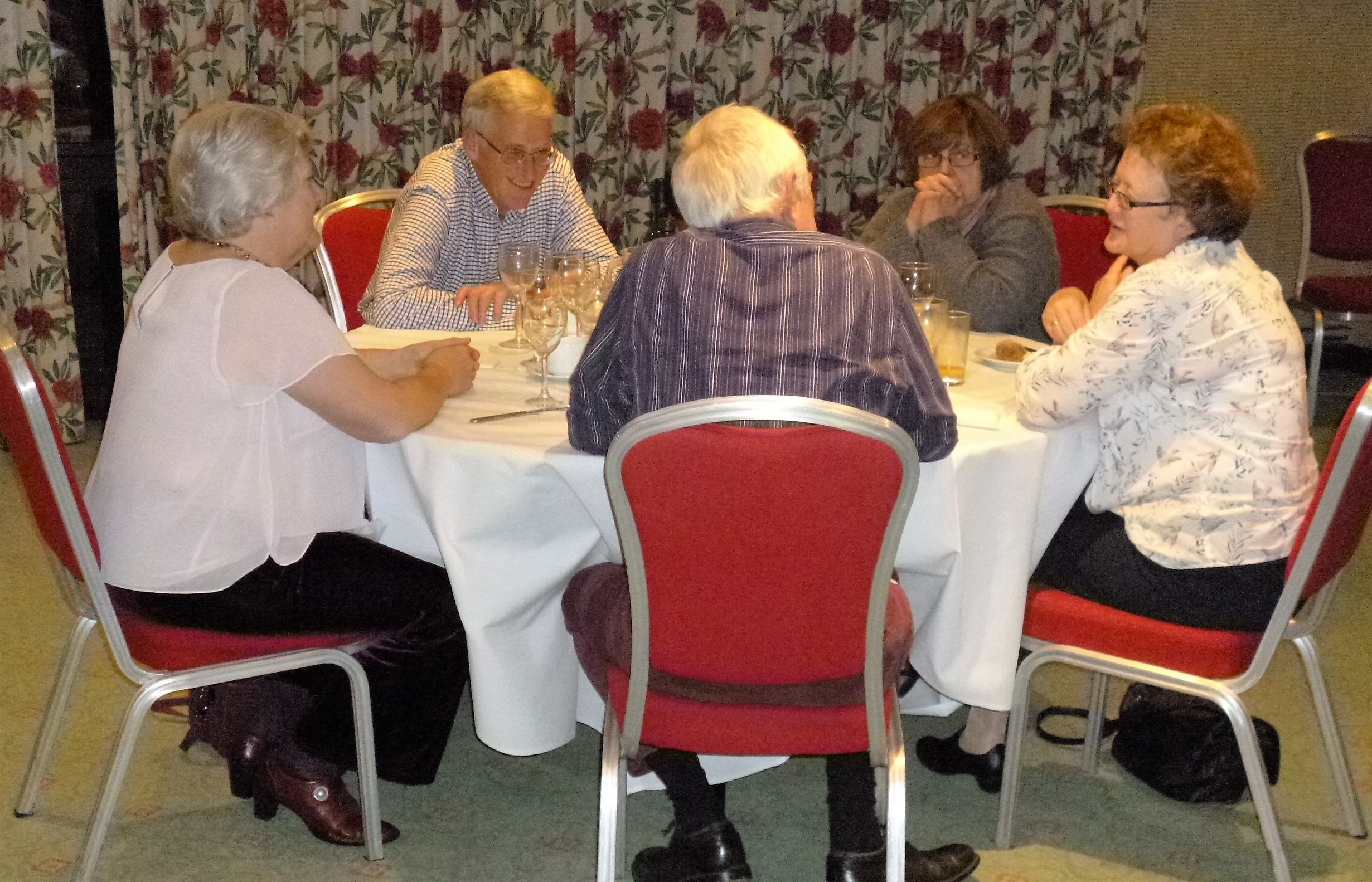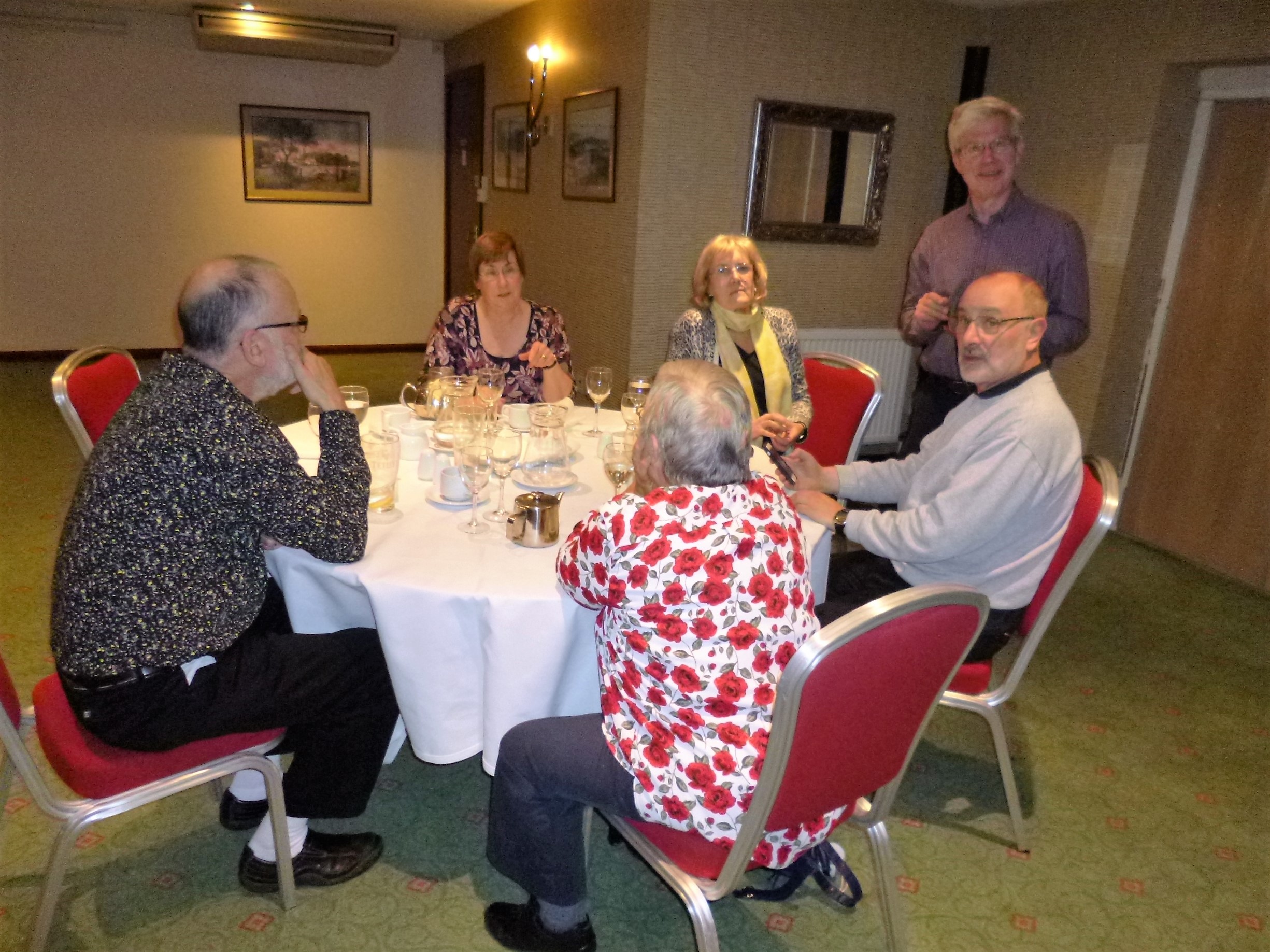 We met in the bar ready for the 7.30 meal and were shown to our own room.  Instead of the usual long table we had 3 smaller ones, which for some reason meant that we had less interaction with everyone (and were perhaps quieter?).  Maybe we should have swapped tables after each course?