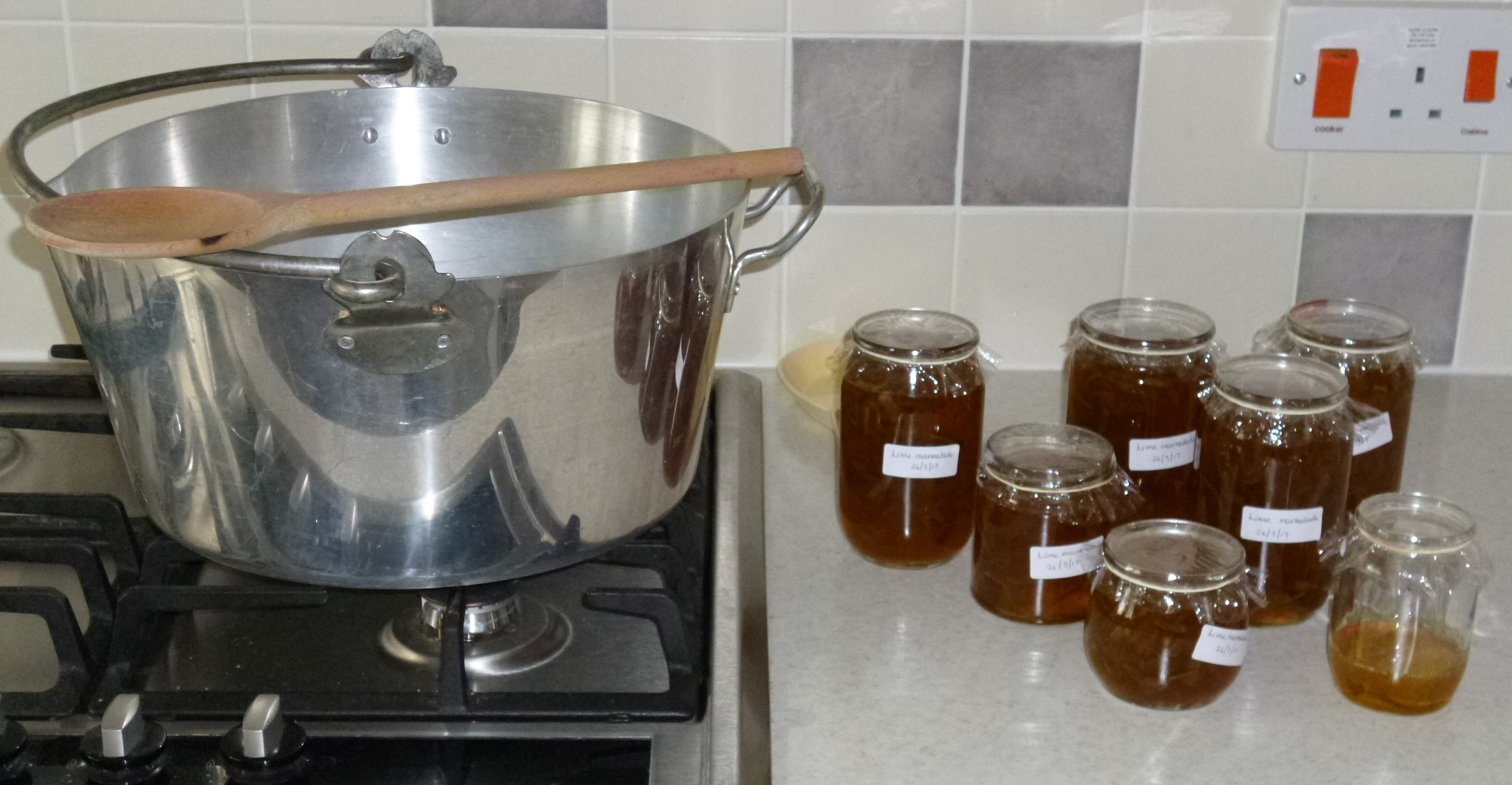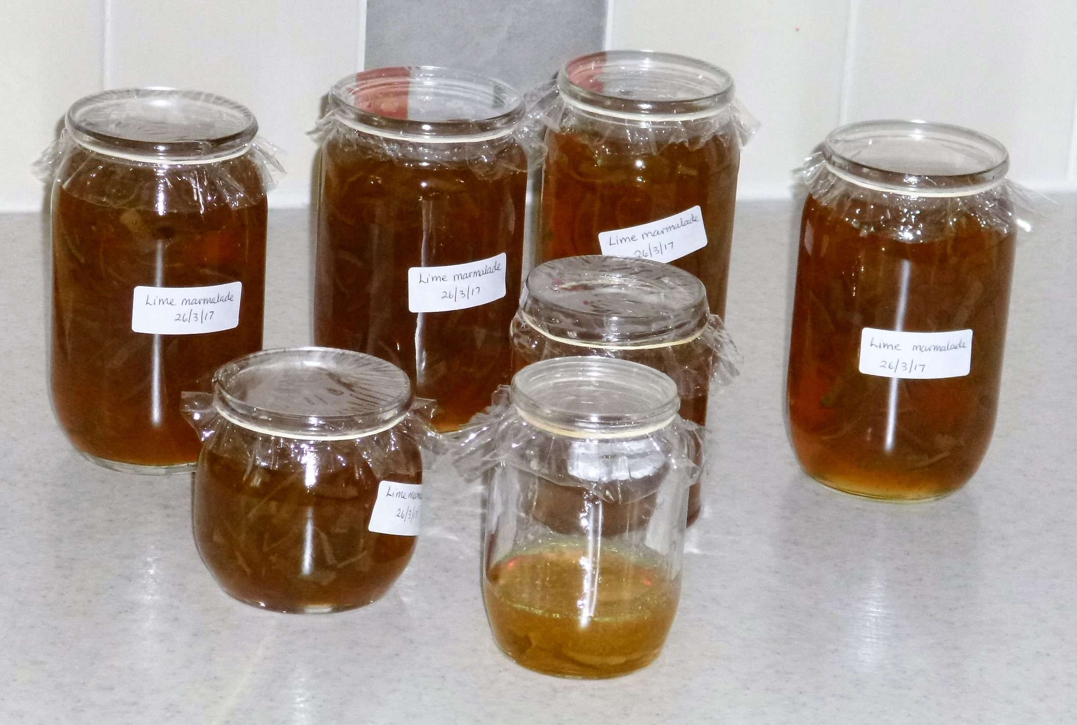 I initially found it hard to remove the pith from the skins, but got a sort of knack of doing it after a few tries. The trouble with limes is that they are so small that there are a lot to remove the pith from and cut up. I did that on the Saturday and then made the marmalade on the Sunday afternoon. I left it to boil for a little too long so a bit too much water had boiled away, so I adjusted that and added the sugar and boiled some more. It seemed to reach setting point so it was skimmed and left for a while so the peel wouldn’t rise in the jars. I got involved with something else so left it longer than usual, but it didn’t seem to matter. It was potted up and labelled and left to cool and the washing up was done…..
