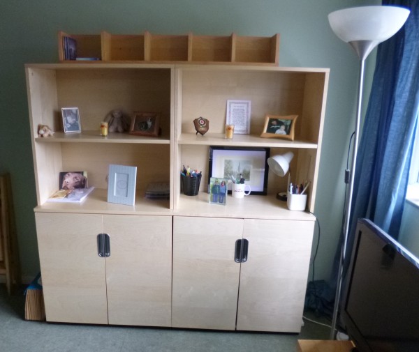 The next Saturday we managed to put together both of the top bookcases and the other cupboard and it only took about 3 hours. It helped that the bookcases were easier and we had a better idea what we were doing with the cupboard, but the hinges were still a bit of a problem. I was still quite tired afterwards but not as much as the previous week and I didn’t ache anywhere near as much the next day. It was a relief we got it done as I didn’t want to spend another Saturday afternoon on it. The end result seems to be fairly satisfactory.